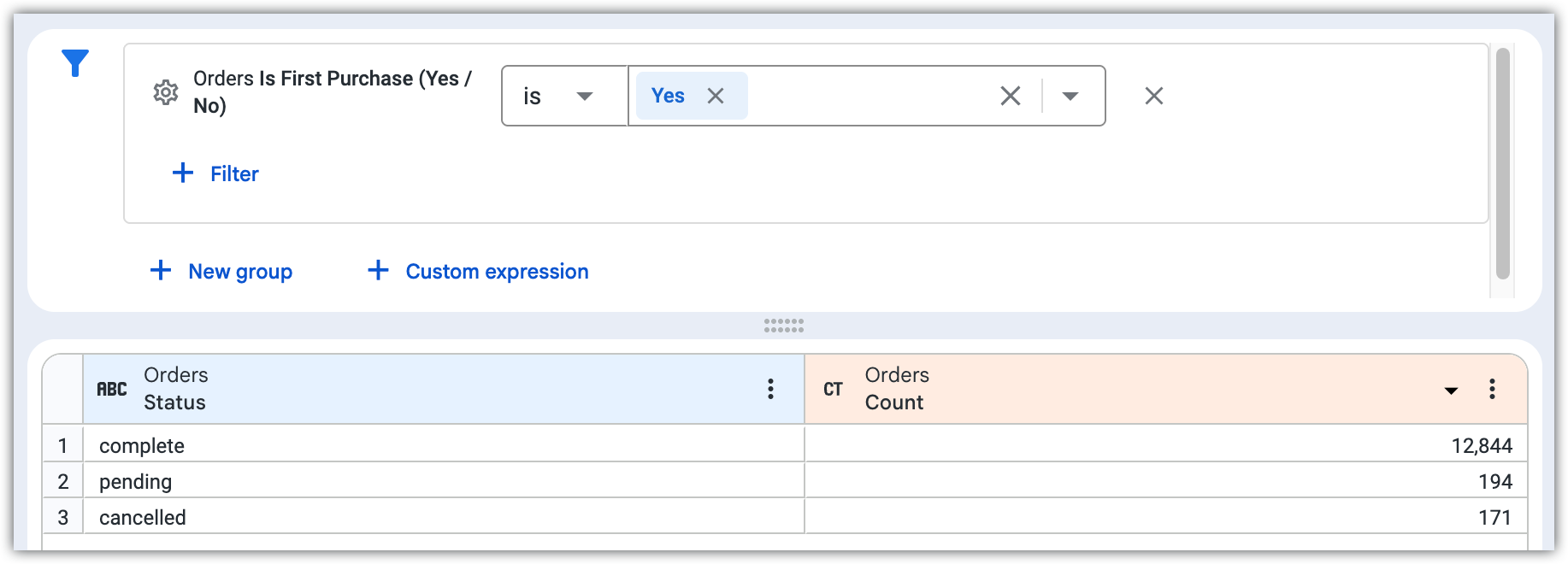 For example, say you've created an Explore to view the status of first-time purchases. The Explore includes the Orders Status and Orders Count fields. Then, you add a filter on an Orders Is First Purchase (Yes/No) dimension with the value YES.