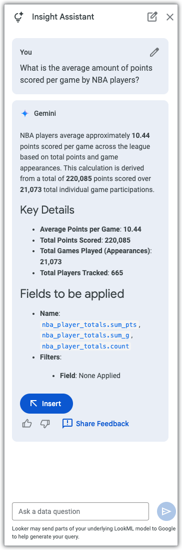The Gemini Insight Assistant lets you use natural language to ask questions about and analyze the data that's used by a specific Explore. To use the Gemini Insight Assistant to ask questions about and generate queries for your data, follow these steps: