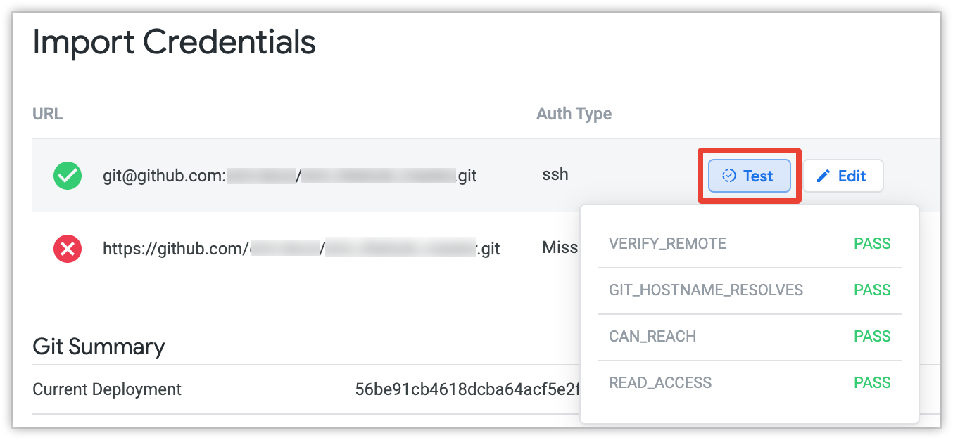Once you pass the connection tests and connect to the repository, the Import Credentials section shows a green checkmark next to the repository name.