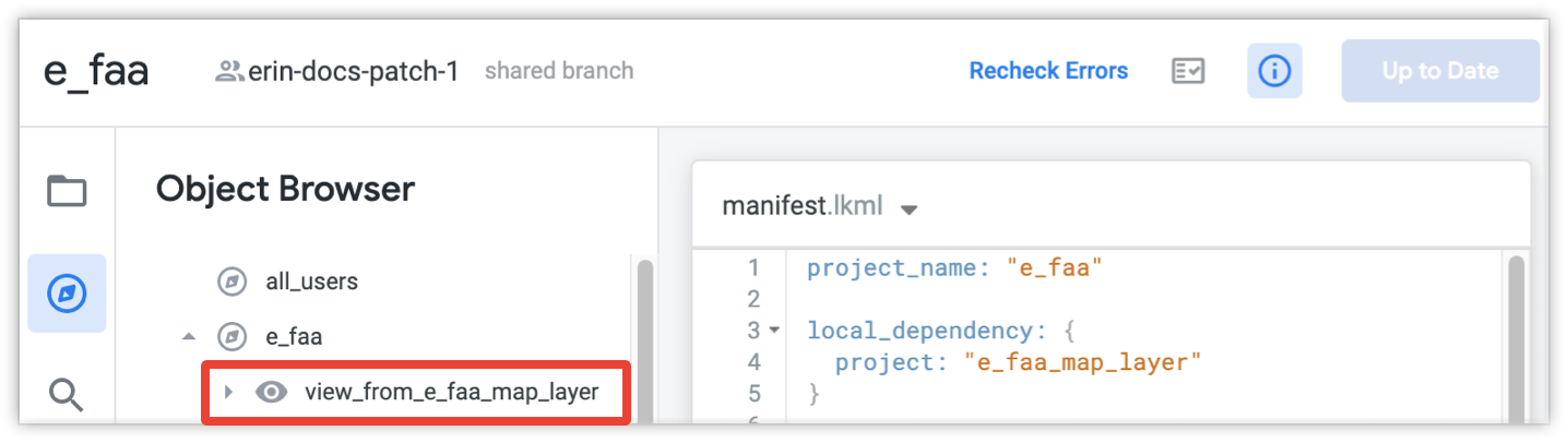 You can also view objects from imported project files that are included in the active project from the object browser. Access the object browser from the navigation bar of the Looker IDE.