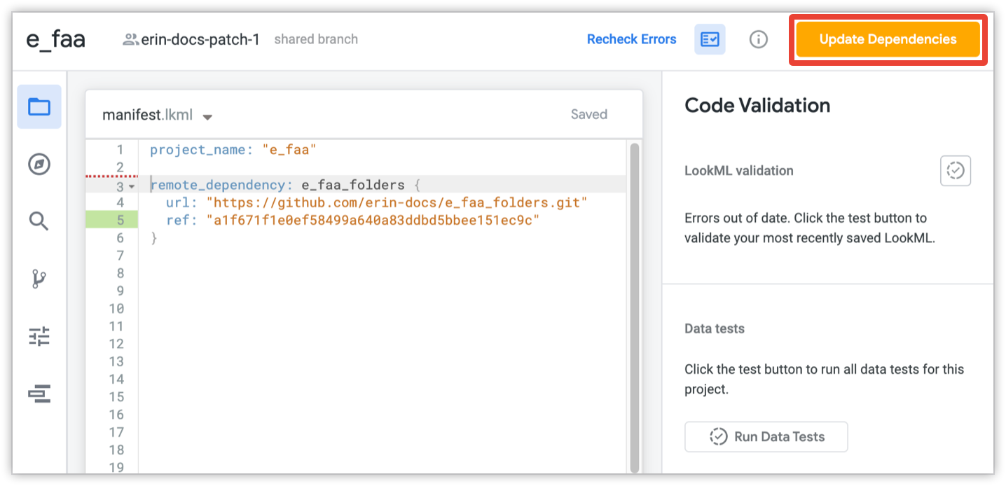 refof a Git branch or a Git release tag, therefparameter shows which version of the files (the remote project commit SHA) your project is currently using. If there are new commits in the remote project, Looker will display the Update Dependencies button in the IDE so you can bring in the latest remote project files. Therefvalue in the manifest lock file will then be updated to show the latest commit SHA for that branch or release tag. - If the remote project was defined in the manifest file with a