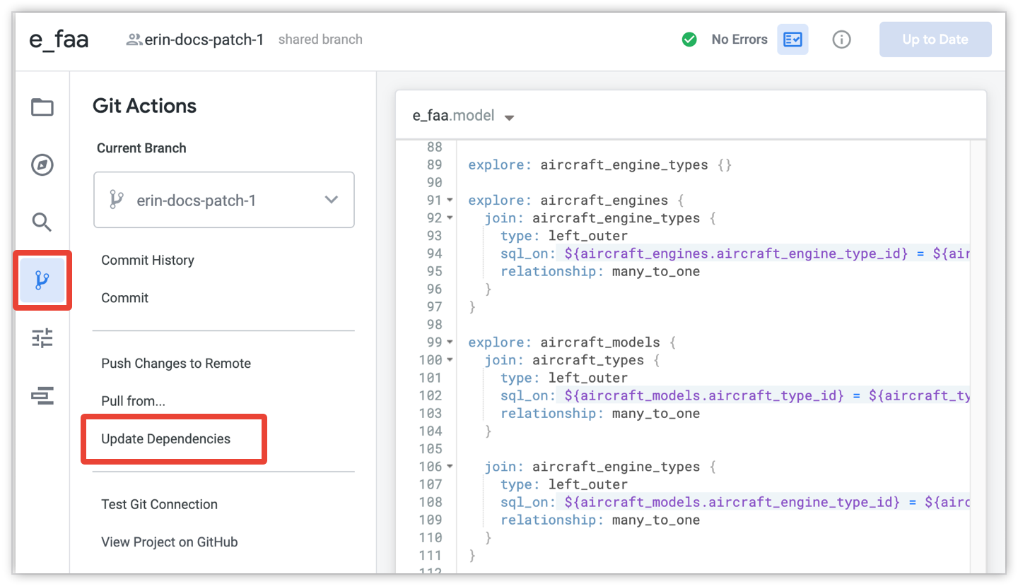 If new commits exist, Looker will display the Update Dependencies option in the Git actions panel of the IDE.
