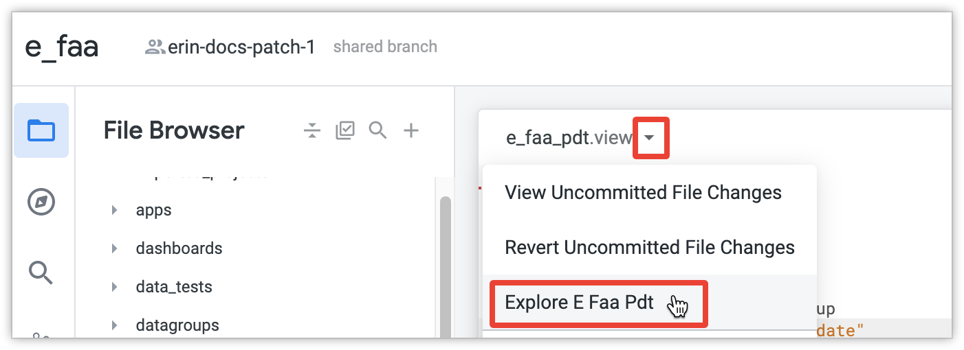 include: "/views/e_faa_pdt.view" explore: e_faa_pdt {}- In an associated model file, use the