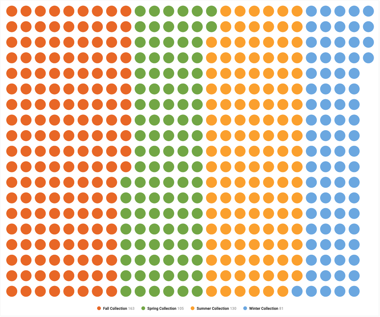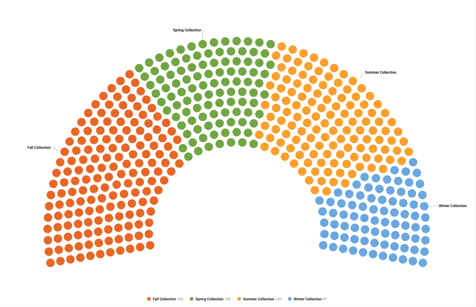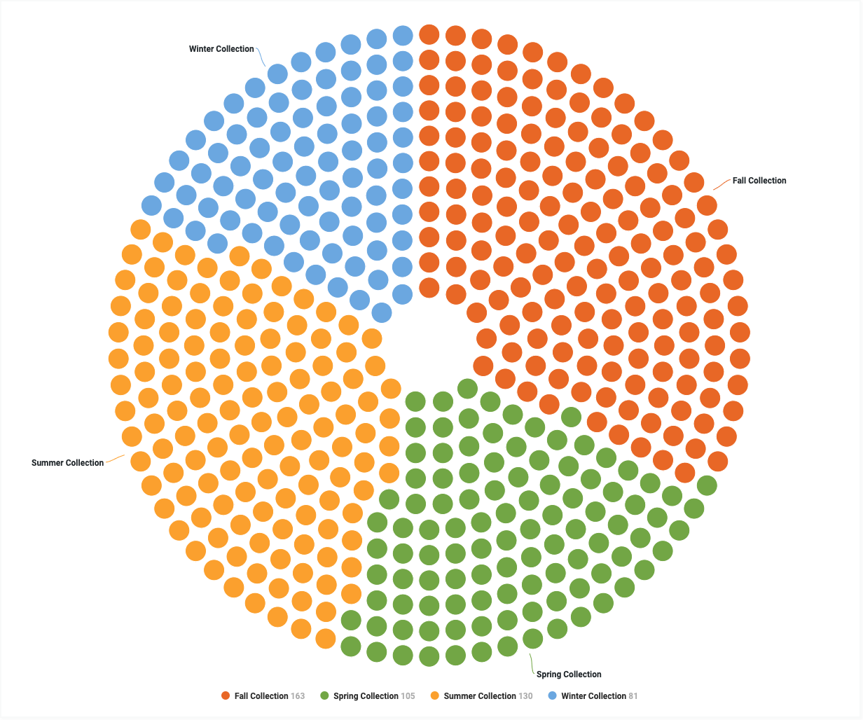 For example, you can create an item chart that shows the Inventory Item Count measure value over several different Seasonal Collection dimension values. The dots will be colored according to the dimension values.