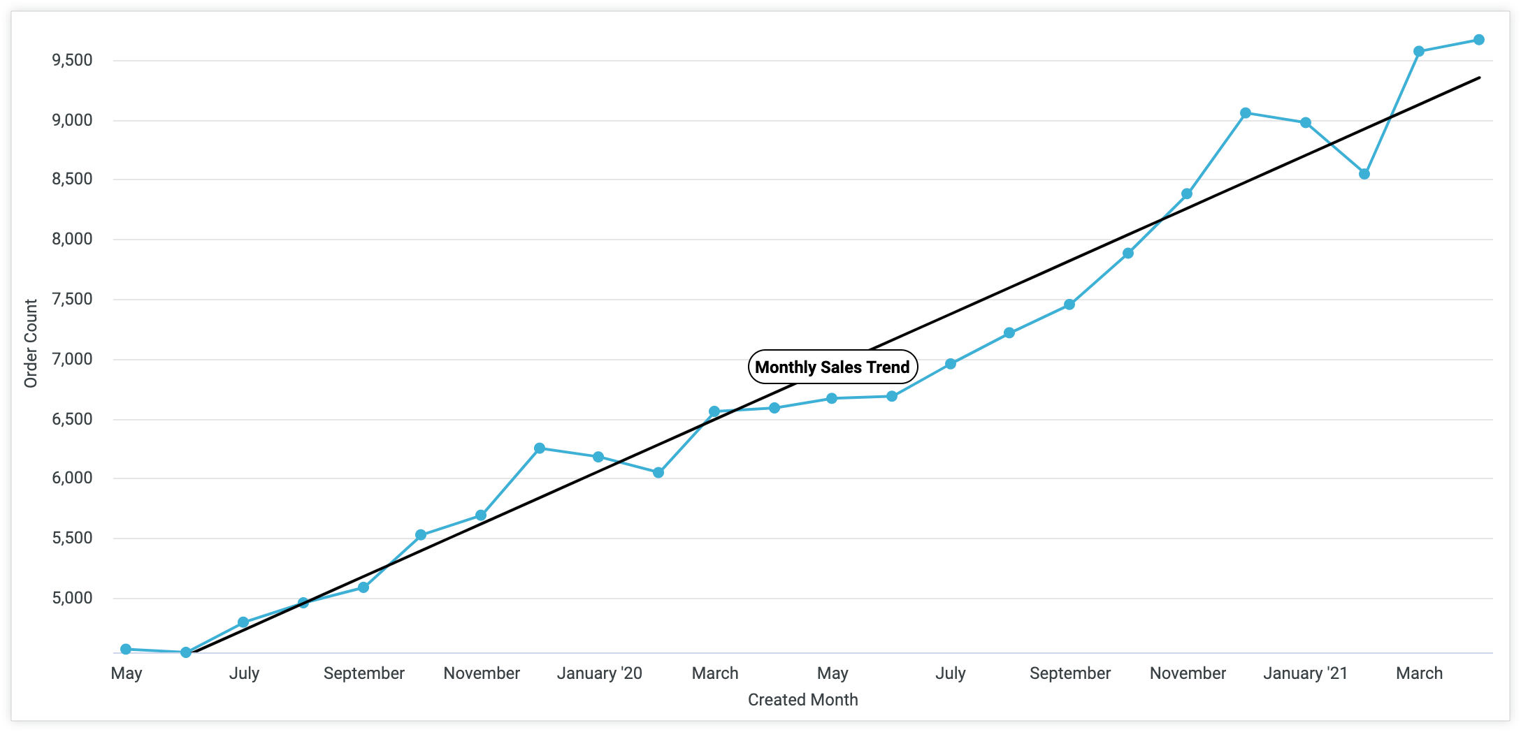 o, isy = a + b * x + ... + k * x^o.Moving Average: The data is plotted along the y-axis as a moving average, also called a rolling average. It is typically used to smooth out minor fluctuations and show an overall trend more clearly. Each point on the moving average trend line is the average value of the previous data points. The number of previous data points to include can be specified with the Period setting. For example, if you apply a trend line to Daily Sales, and the period is set to 7, then, for a given date, the Moving Average plots the average sales for the 7-day period ending on that date. If the number of previous data points is less than the period setting, the Moving Average is calculated over the partial periods, but is rebased to the number of available data points.