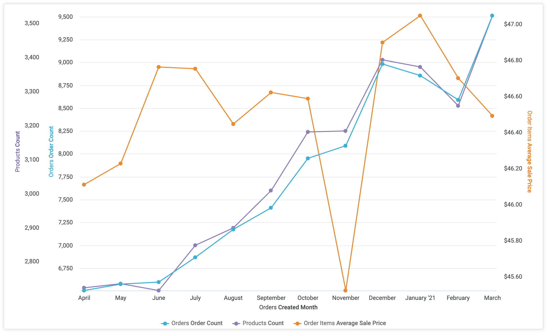 y = a * x^bwherebis slope (gradient) andais the y-intercept (the x value where the line crosses the y-axis).Polynomial: A polynomial trend line plots the y-variable as a polynomial function of the given order and x-value. Polynomial trend lines require you to enter the desired order of the polynomial to compute. Looker defaults to an order of 3.