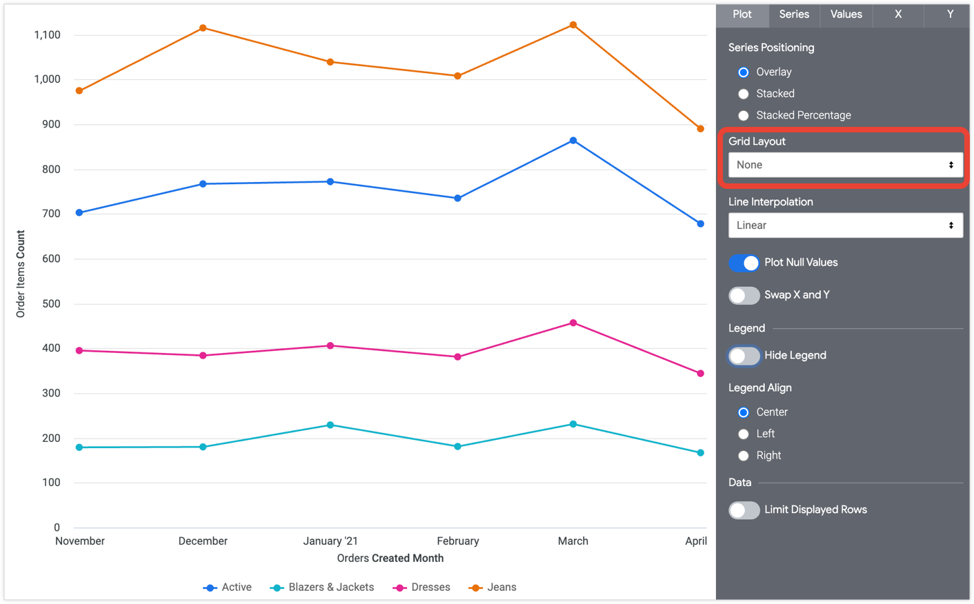 - Overlay: For scatterplot, line, and area charts. Series are overlaid on the chart.