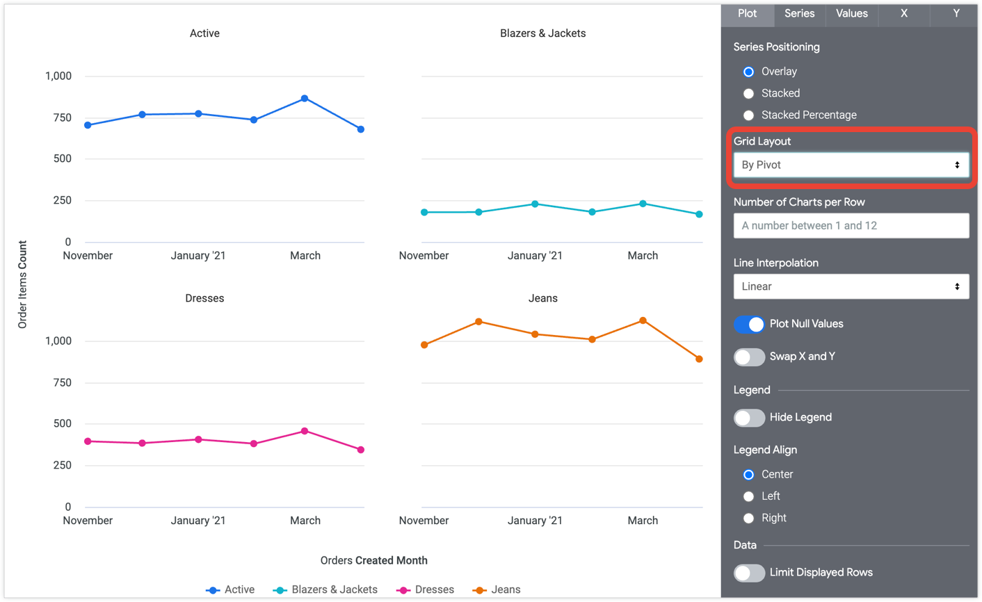 When you select By Pivot or By Row from the drop-down menu, the Number of Charts per Row option appears. You can input a number between 1 and 12. If you do not input a number, Looker arranges the charts as evenly as possible.