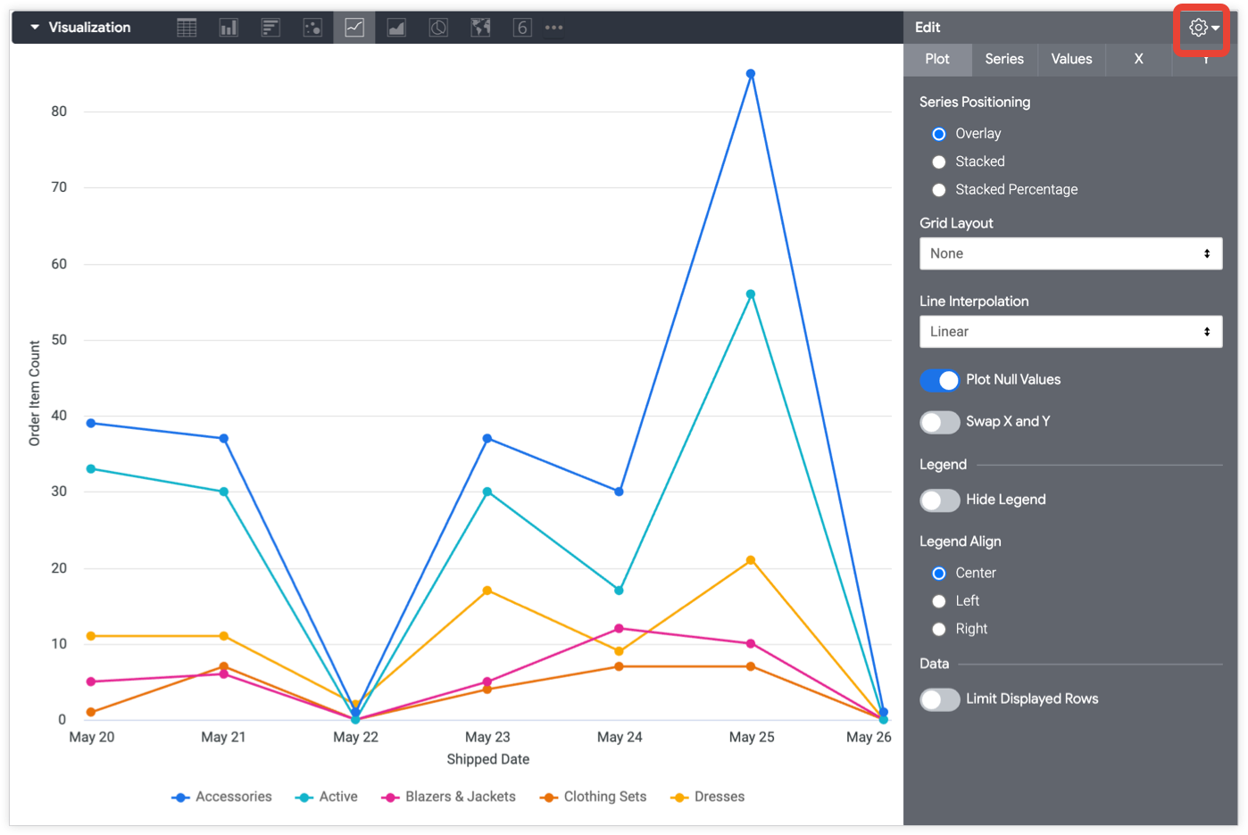 This page describes the options for editing line charts in the visualization menu. Click Edit in the upper right corner of the Visualization bar to format your visualization.