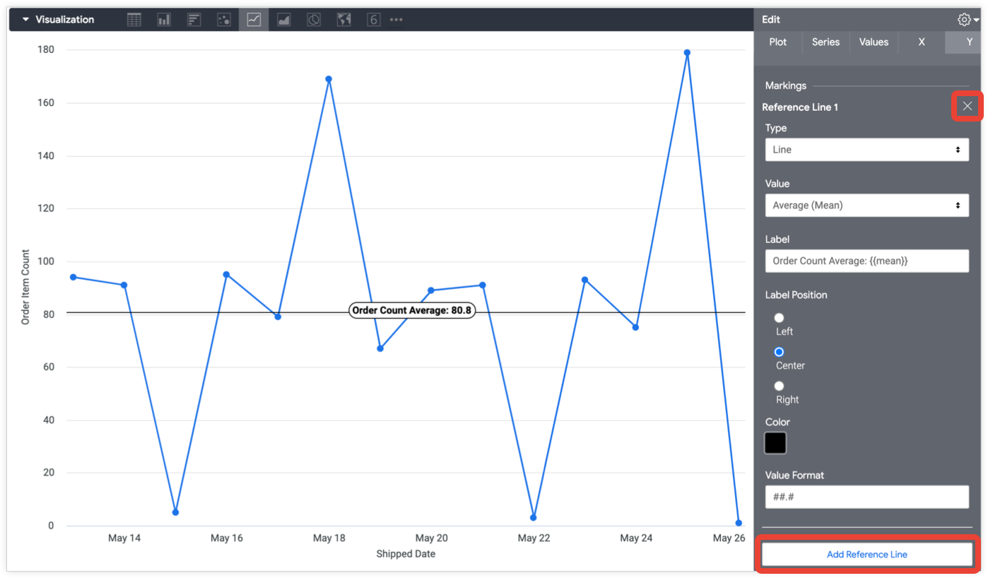 The Add Reference Line button enables the creation of reference lines in a chart. Click it as many times as you like to add any number of reference lines and reveal the settings for those reference lines. To delete a reference line, click the X in the upper right of its settings.
