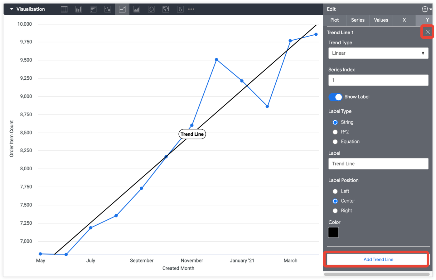 Trend lines show the prevailing direction of the data in a chart. If your chart can support a trend line, you will see the Add Trend Line button in the Y menu options.