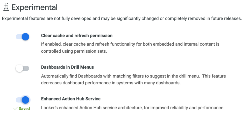An admin user can enable the Enhanced Action Hub Service Labs feature to improve reliability and performance of the Looker Action Hub.