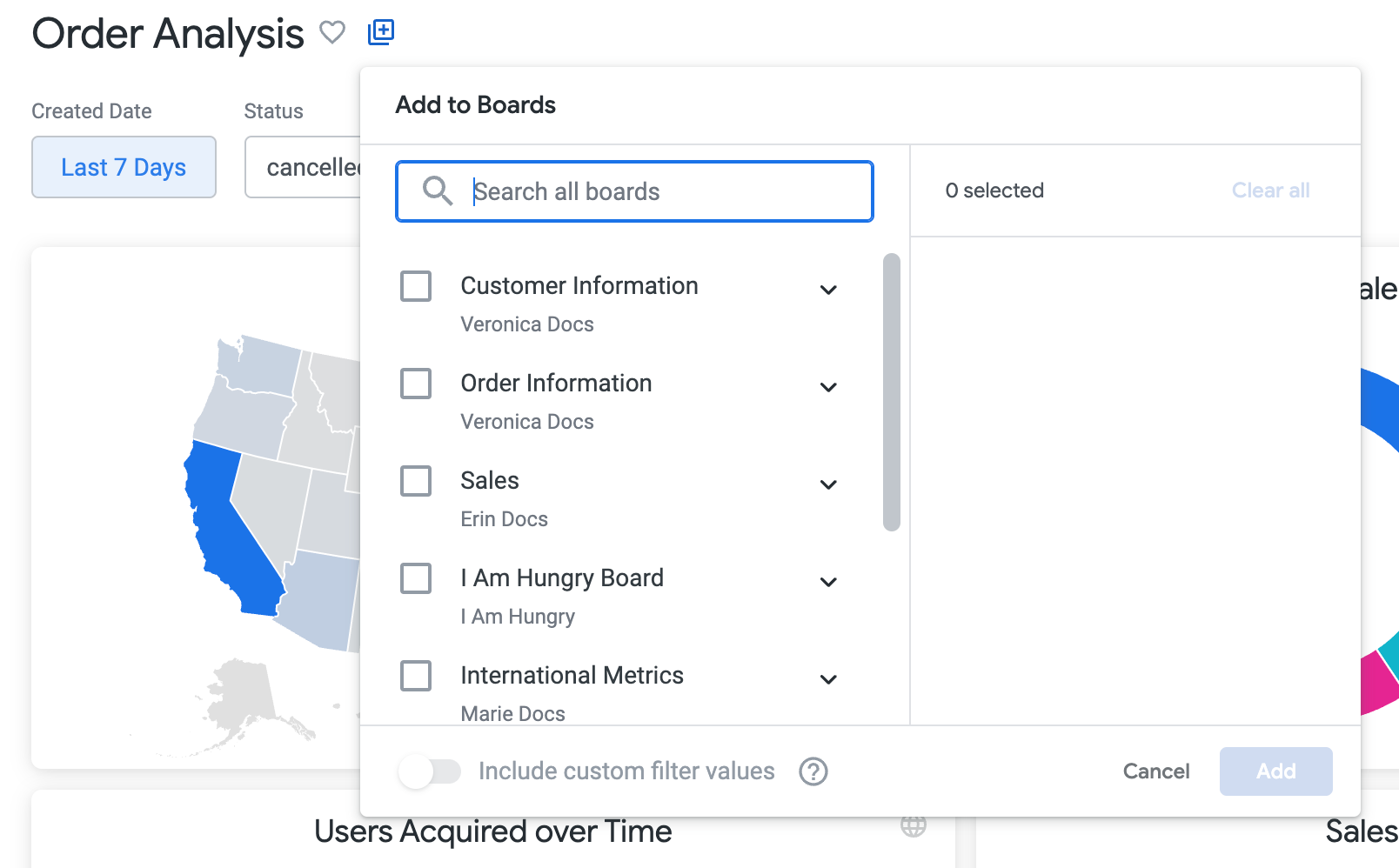 You can now add a dashboard to one or more boards by selecting the Add to boards button on the dashboard.