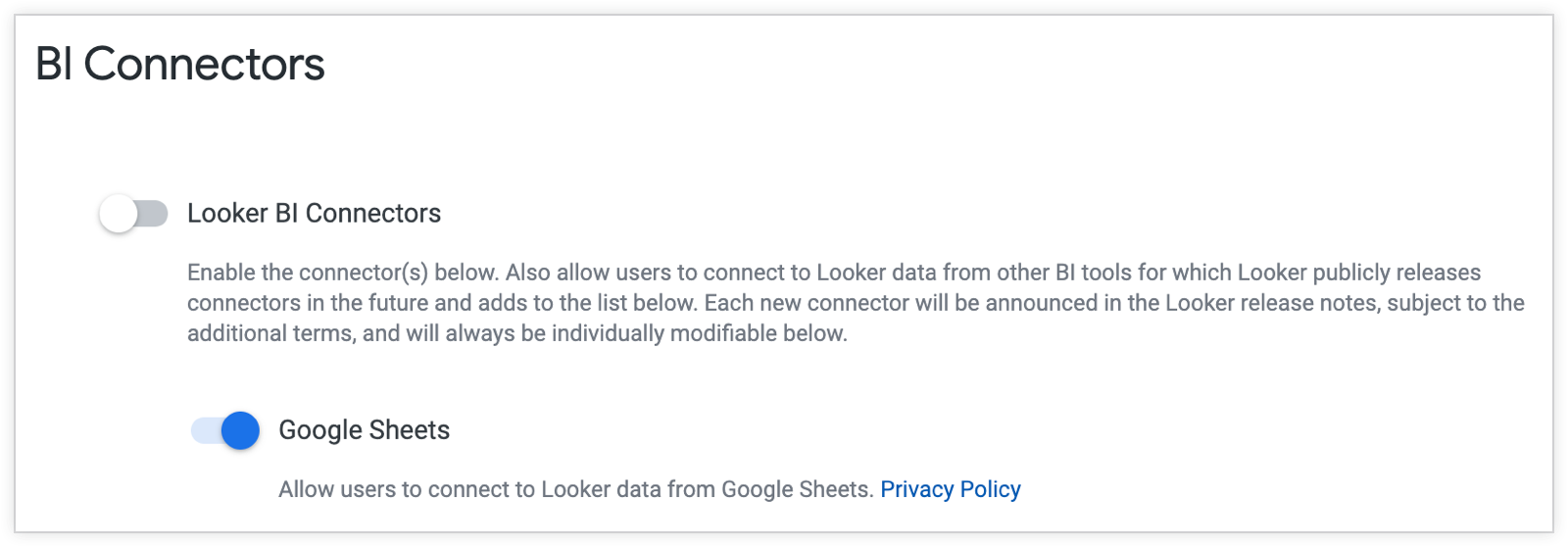 • Looker admins must first enable the feature on the new BI Connectors admin page, which can be found in the Platform section of Looker's Admin menu