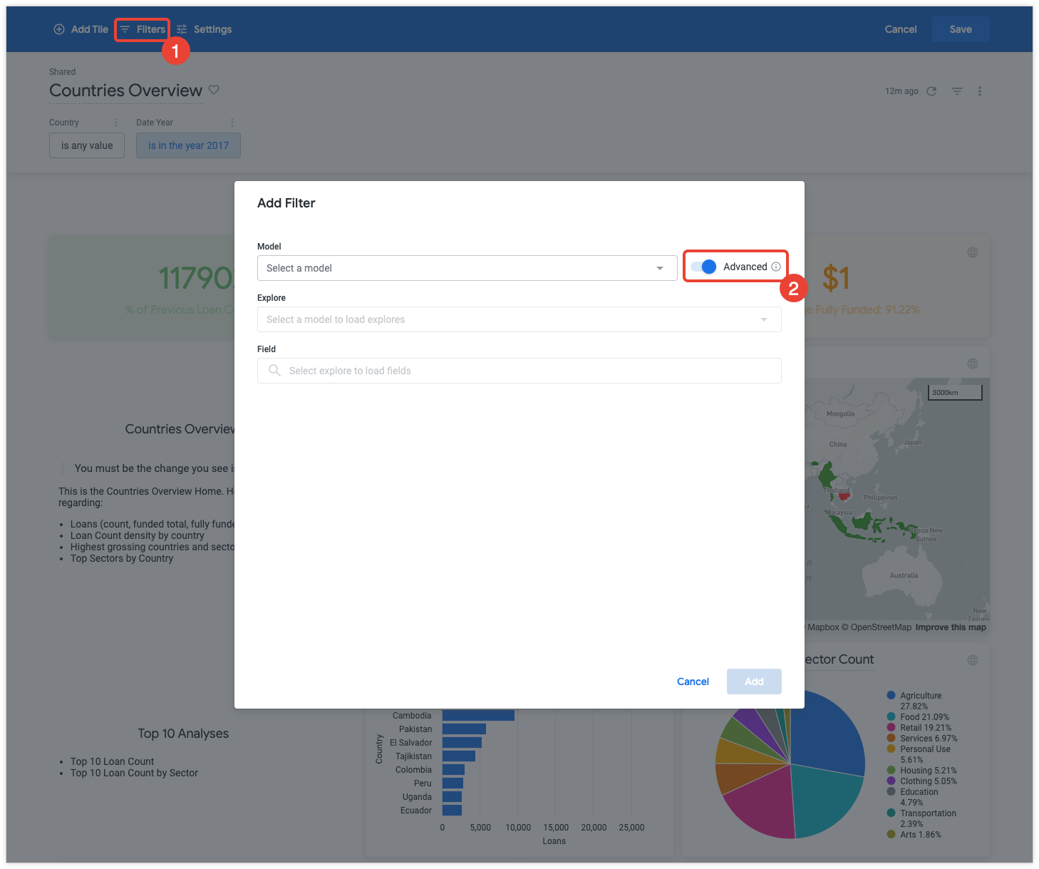 • Dashboard creators can now create dashboard filters on fields from Explores that are not present on the dashboard by turning on the Advanced toggle in the filter creation flow.