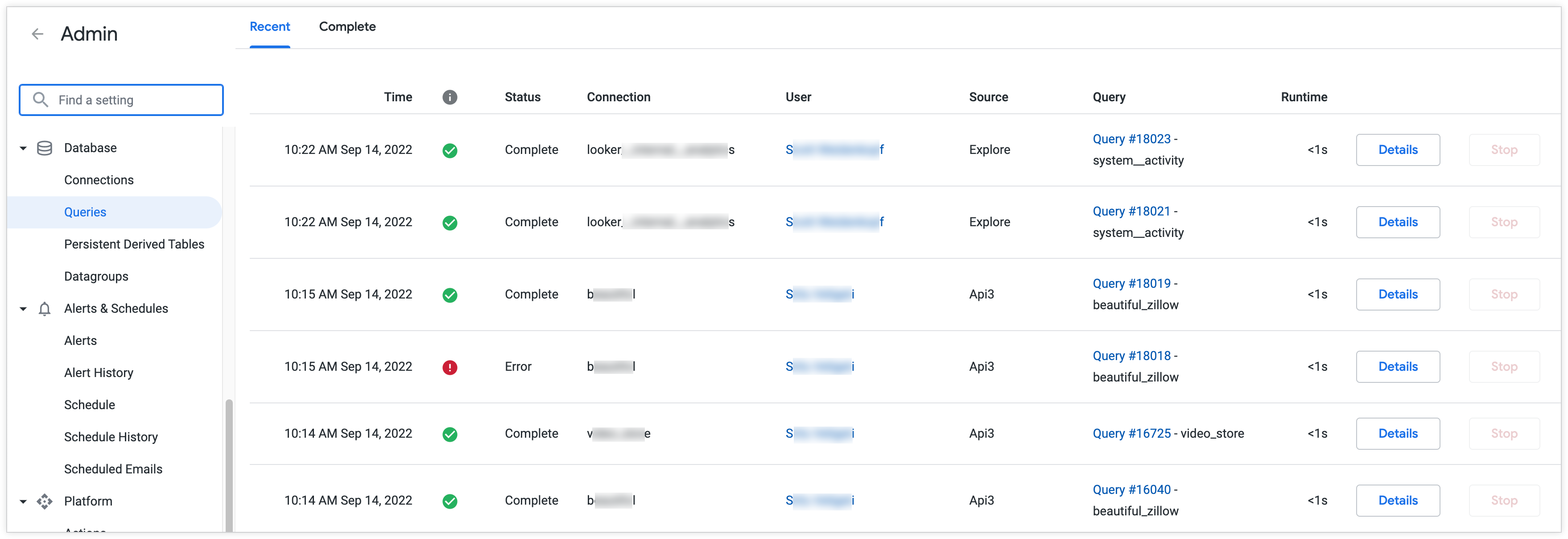 A Looker Labs feature that migrates the Query Admin UI from Angular to React refreshes the look-and-feel with standard Looker components. In addition, pagination is available, as well as a separate tab for recent and complete queries, allowing customers with large history tables to effectively administer their instances.