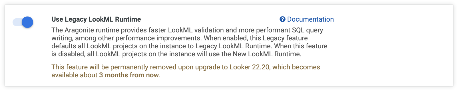 • You can revert to legacy LookML runtime at the instance level by turning on the Legacy LookML Runtime legacy feature.