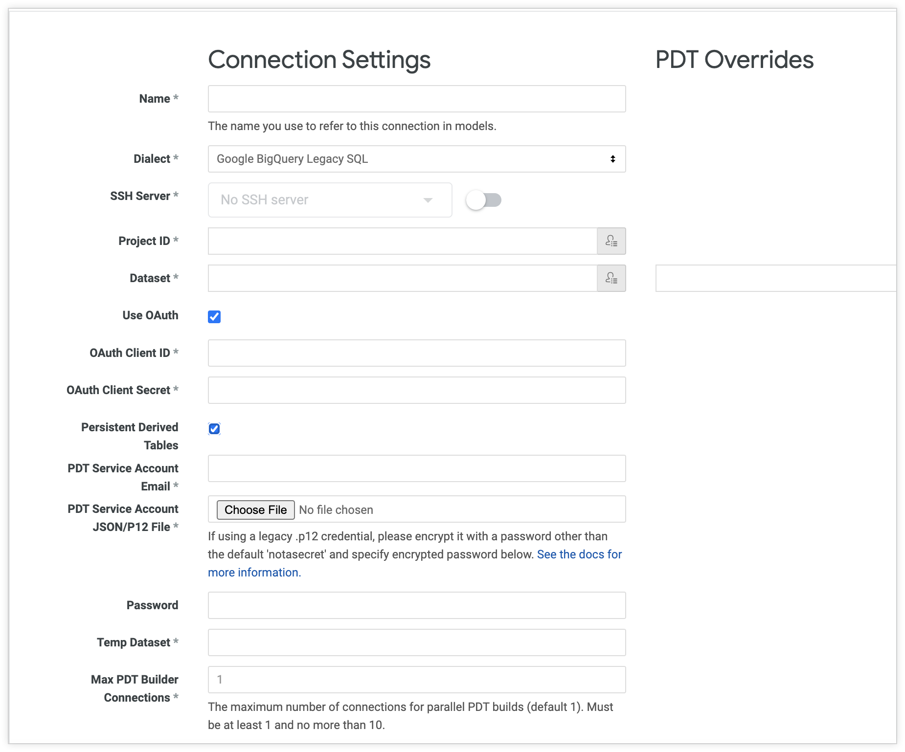For Google BigQuery connections that use OAuth, Looker can now access your database for PDT processes using a separate BigQuery service account that you specify in Looker's connection settings. See Enabling PDTs for Looker connections to BigQuery with OAuth for more information.