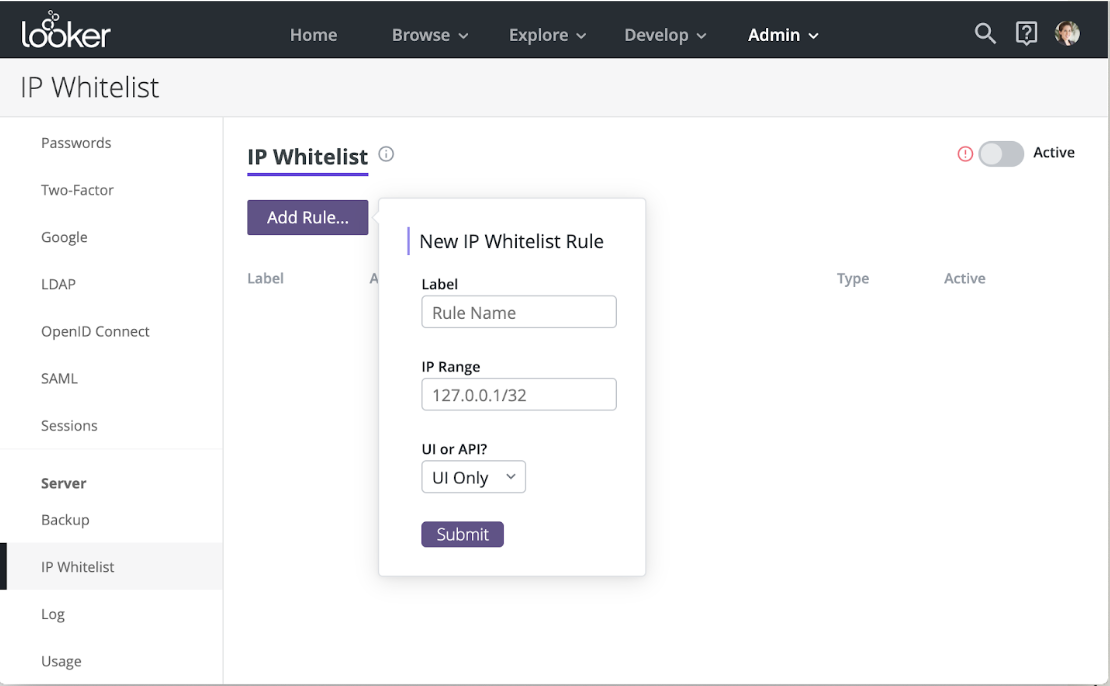 IP whitelisting. This new feature provides a mechanism for Looker administrators to whitelist certain IP addresses or blocks of IP addresses that can reach their Looker instance. When IP whitelisting is activated, Looker will refuse connection attempts from all other IP addresses. Note: This feature is available only for instances hosted by Looker. Learn more.