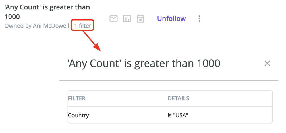 - Filters are applied to the visualizations of alerts and to the links in an alert email. Learn more.