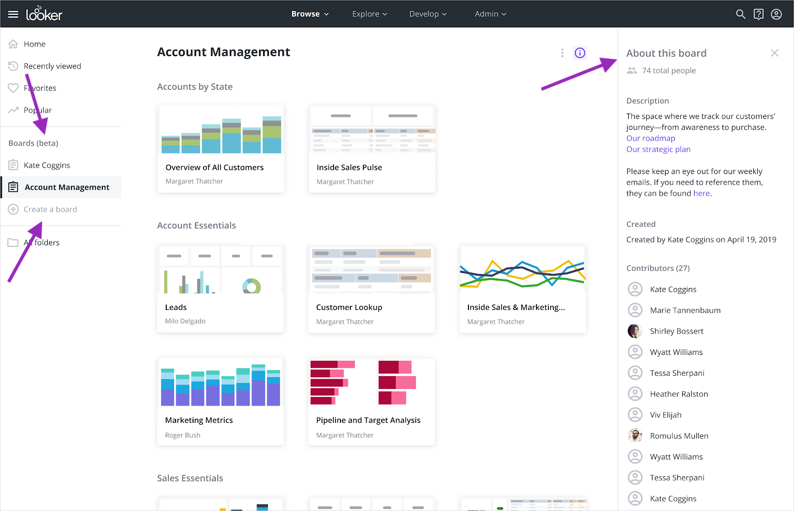 Boards. Users who share a board will have the option to send an email notification to newly added users, encouraging them to add the board to their list. Learn more.