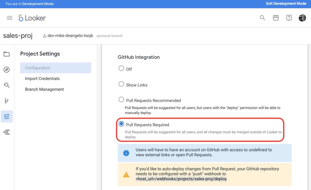 For the CI/CD workflow to function, LookML must be stored in a git repository and connected to a Looker project. In the project settings, Git Production Branch Name must be set to main and Enable Advanced Deploy Mode must be enabled.