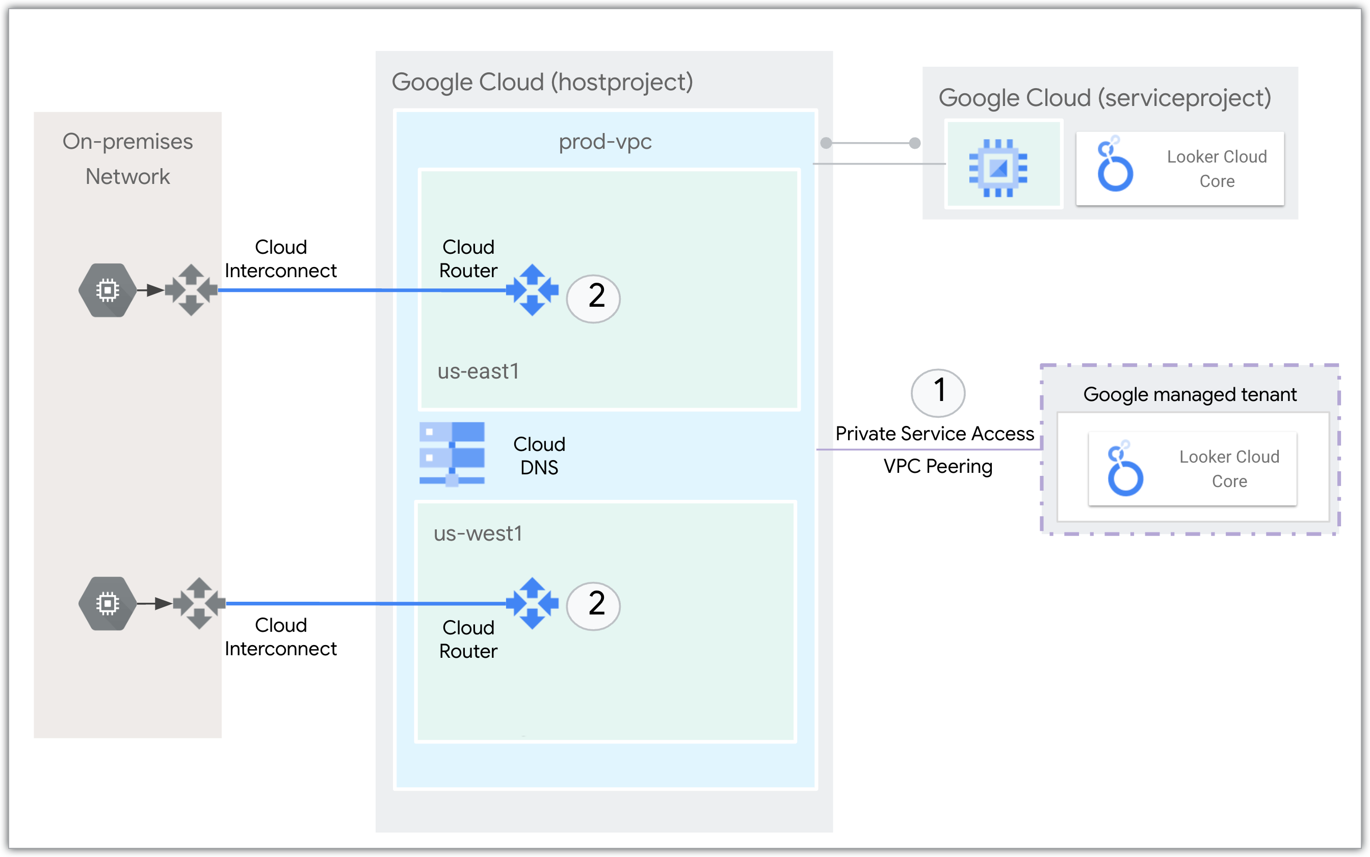- Configure DNS forwarding, which will let Looker (Google Cloud core) connect to any on-premises resources.