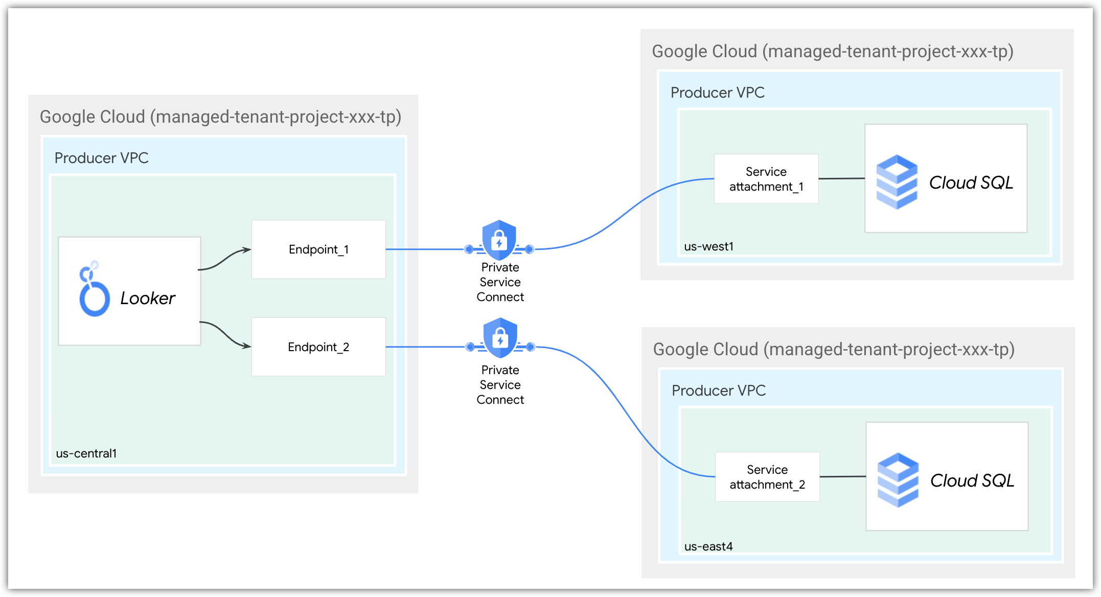 Looker (Google Cloud core) instances that use the updated Private Service Connect service attachment URI support global access. Global access lets you create a Private Service Connect endpoint in a different region from your Looker (Google Cloud core) instance. For example, if your instance is in us-central1, you can create a load balancer with a Private Service Connect network endpoint group (NEG) in us-west1 to access the instance.