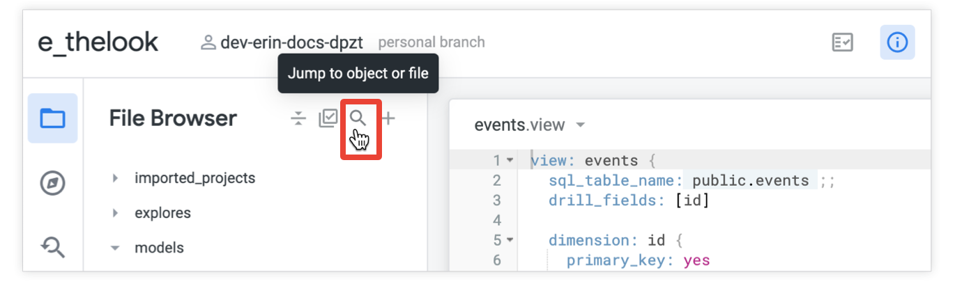 In the Looker IDE, you can do a quick search to navigate directly to LookML objects and project files by using the Jump to object or file feature. Click the Jump to object or file icon from the file browser or the object browser, or use the keyboard shortcut Command-J (Mac) or Ctrl+J (Windows).