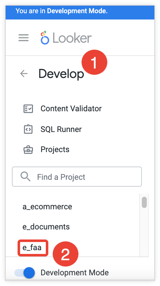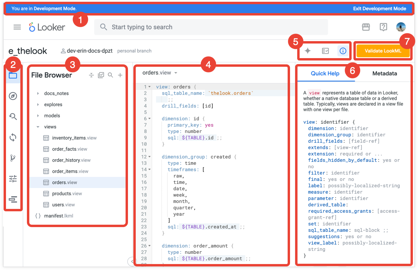 Development Mode banner: This banner indicates that you are in Development Mode, where you can make changes to LookML files and preview how they will affect content on your instance. You can click the Exit Development Mode link in the banner to go into Production Mode.