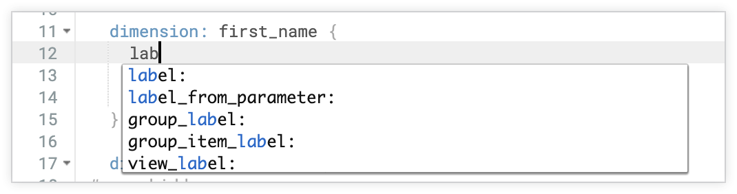 As you type, the IDE suggests possible parameters and values that are sensitive to the context of what you are typing. For example, the suggestions for a dimension's type parameter will only include valid options for that parameter. Also, fields in sql parameters have to be marked with ${...}, so the IDE adds that syntax when suggesting fields.