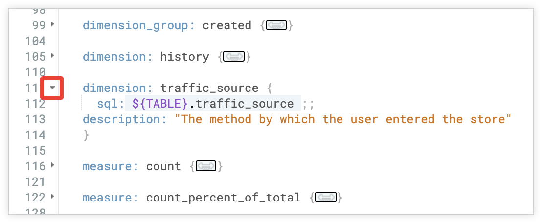 A small arrow appears in the gutter next to the start of each top-level LookML parameter in the file. Selecting this arrow folds or unfolds that section of LookML so that you can focus on just particular sections.