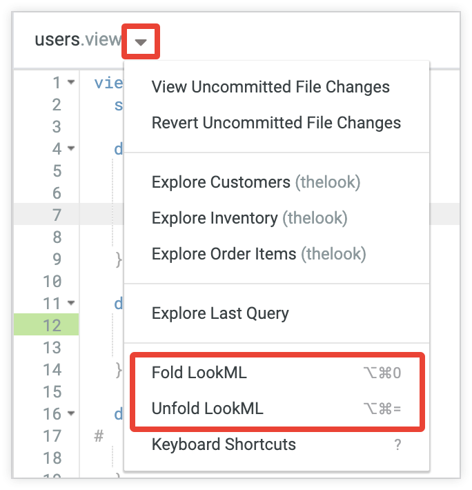 You can also use keyboard shortcuts to fold and unfold LookML.