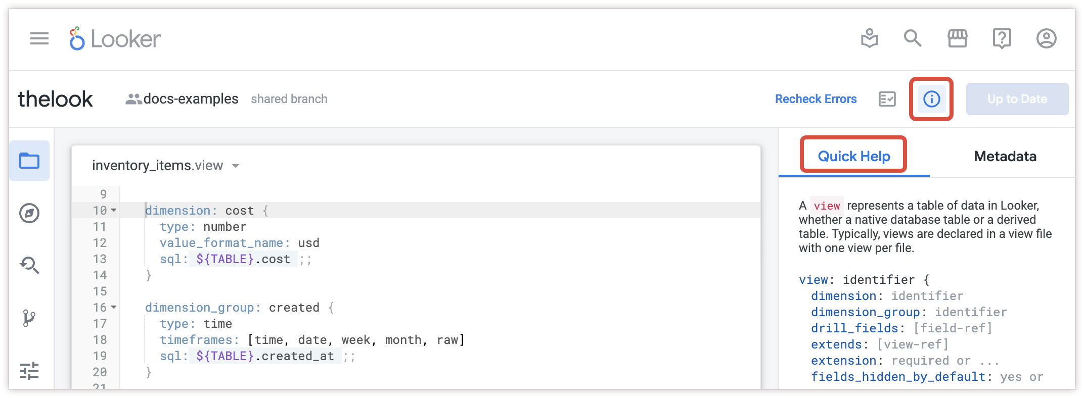 - Quick Help: Displays the LookML options that apply to the cursor's location in a LookML file and provides a link to the Looker reference documentation for each LookML parameter.