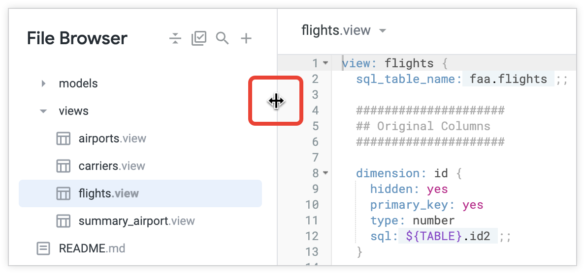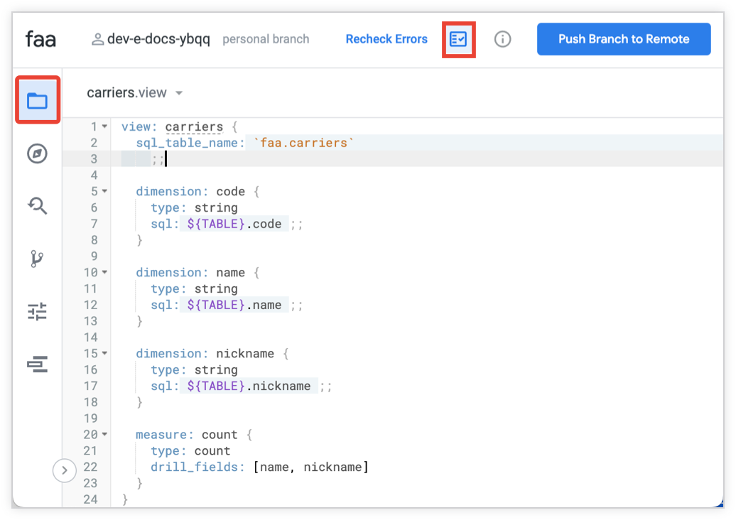 - Open LookML file that is displayed in the file browser