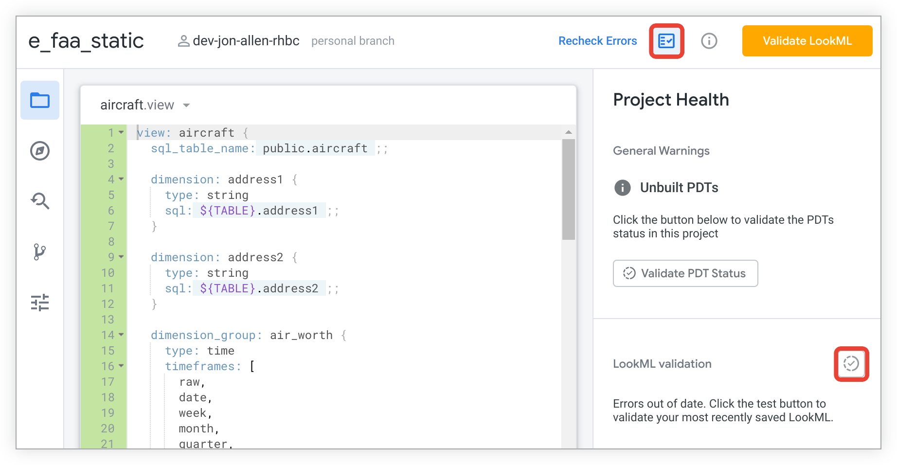 To run the LookML Validator, select the Validate LookML button at the top right of the Looker IDE; or select the Project Health icon at the top of the IDE to open the Project Health panel, and then click the Validate LookML icon.