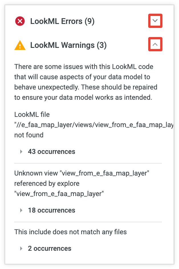 After you run the LookML Validator, you may see a list of errors and other warnings that you should address. You can select any arrow to expand the lists of errors or warnings.