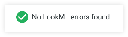 When there are no issues found by the validator, Looker displays a green checkmark along with the text No LookML errors found.