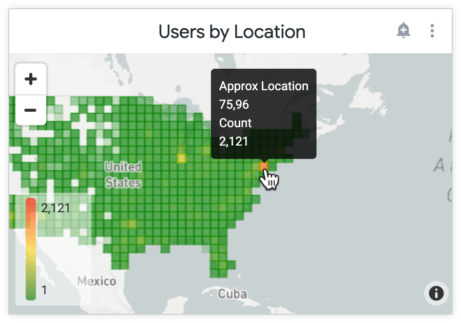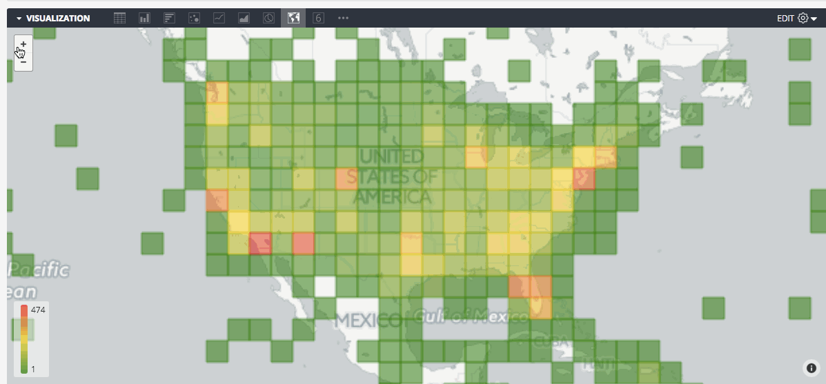 You can display data in the underlying query as a heatmap grid. It works by dividing the visible map into equal squares, then calculating which values in your data fit into each square. The squares are colored according to a measure that you choose. Zooming this map in or out will prompt Looker to re-calculate the grid, so that the granularity is appropriate to the zoom level.