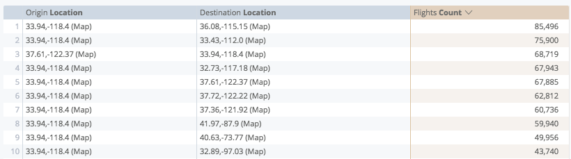 The Connect with Lines map visualization takes two fields of type:location from your query, then connects them together in the visualization. Adding a measure to the query lets you add a color scale to the lines.