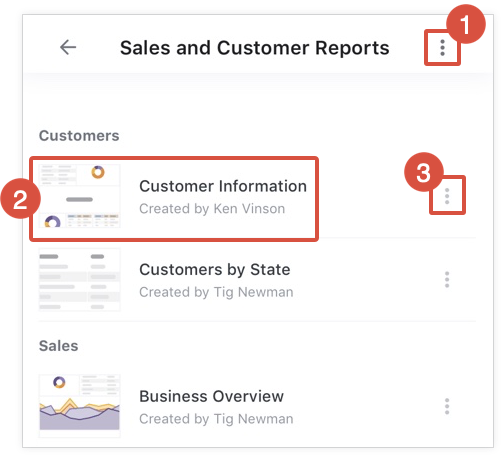 You can also access the three-dot menu for a Look or for a dashboard while viewing that content in the app. See the documentation pages on viewing Looks and on viewing dashboards for more information.