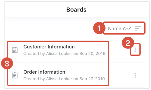 • On the Boards screen and in folders, the sort menu is below the title at the top of the screen.