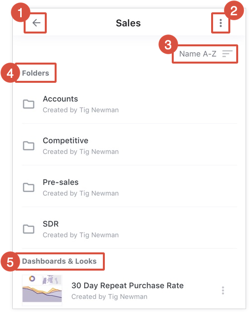 When you open a folder in the Looker mobile app, the app lists the Looks, dashboards, and subfolders that are stored within the folder. You have the following options: