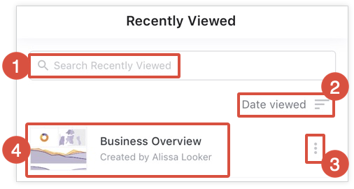 • Recent: Lists up to 20 of your most recently viewed dashboards and up to 20 of your most recently viewed Looks. The Recently Viewed screen includes content that you have recently viewed in either the Looker mobile app or the Looker web app.