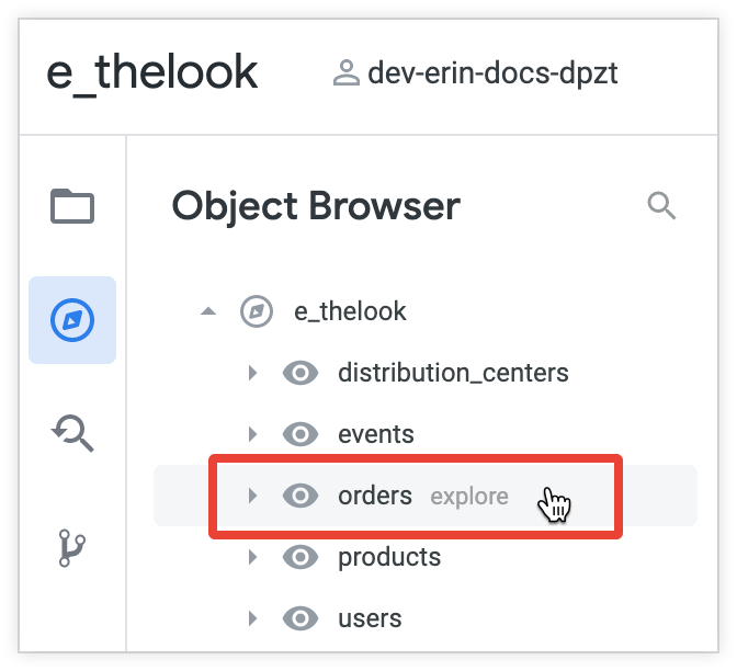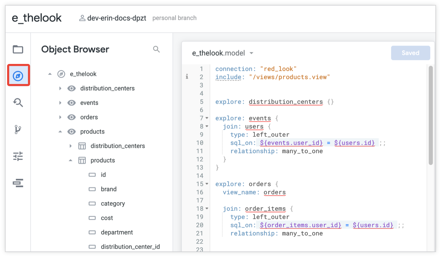 You can use the object browser panel to view the contents of a refined view or Explore, or to navigate to the LookML for the refinements in your project.