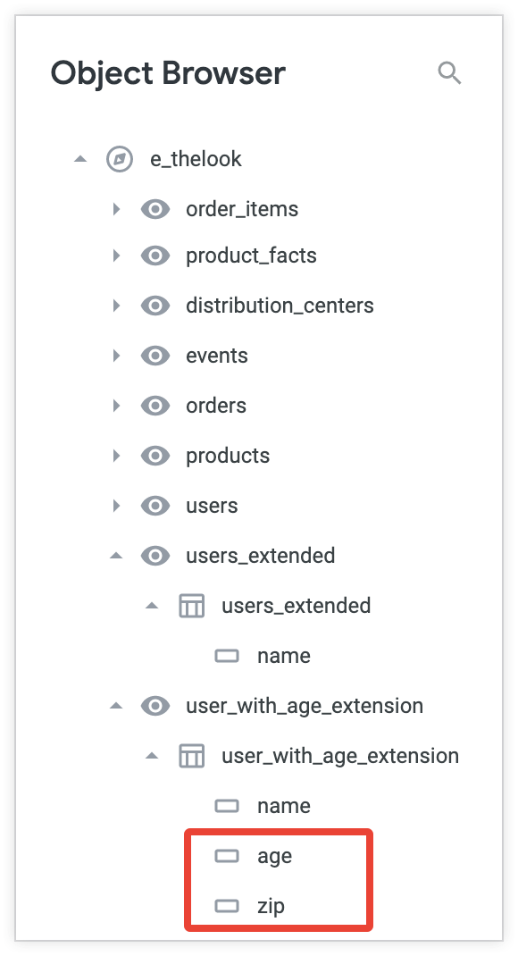 If your project includes a view or an Explore that extends another view or Explore, you can use the object browser panel to view and navigate to the LookML for the extending object. When you expand a view that extends another, the object browser panel shows the fields from the base view along with any fields that you have added in the extending view.