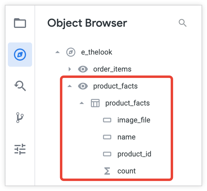 You can then view the product_facts Explore in the object browser panel and expand the Explore to show any views and fields it contains.
