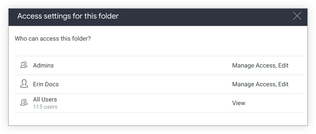 Manage Access, Edit: The user or group has View access and can also manage access to the folder and edit the folder and its content (including renaming folders, moving content, and deleting Looks and dashboards).