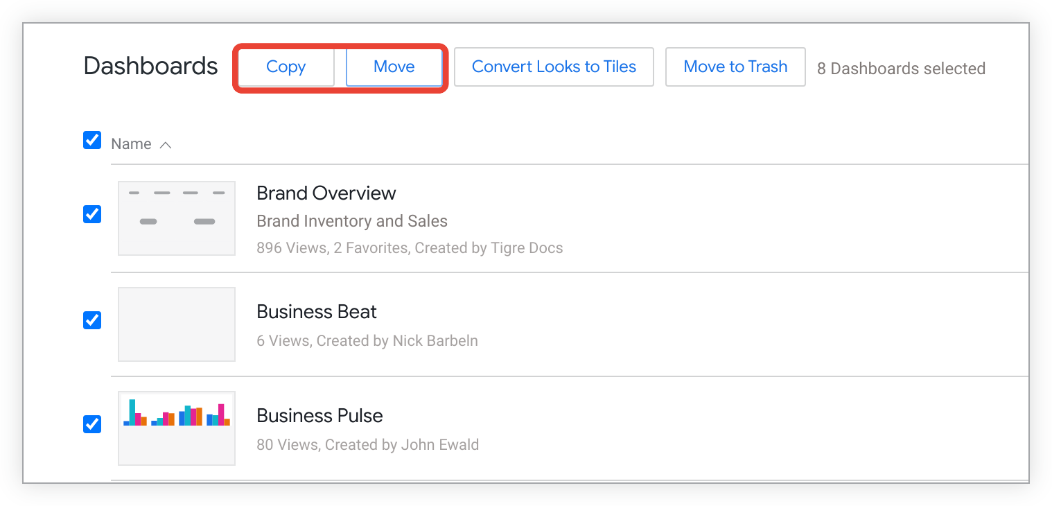 If a dashboard has tiles that are based on Looks, then those Looks must be in the same folder as the dashboard. If you try to move a Look that is used in a dashboard, Looker instead makes a copy of the Look in the new location and keeps the Look in its original location. This ensures that your dashboard doesn't have any missing tiles. If you copy or move a dashboard to a new location, then Looker will copy or move its Looks to the new location as well.