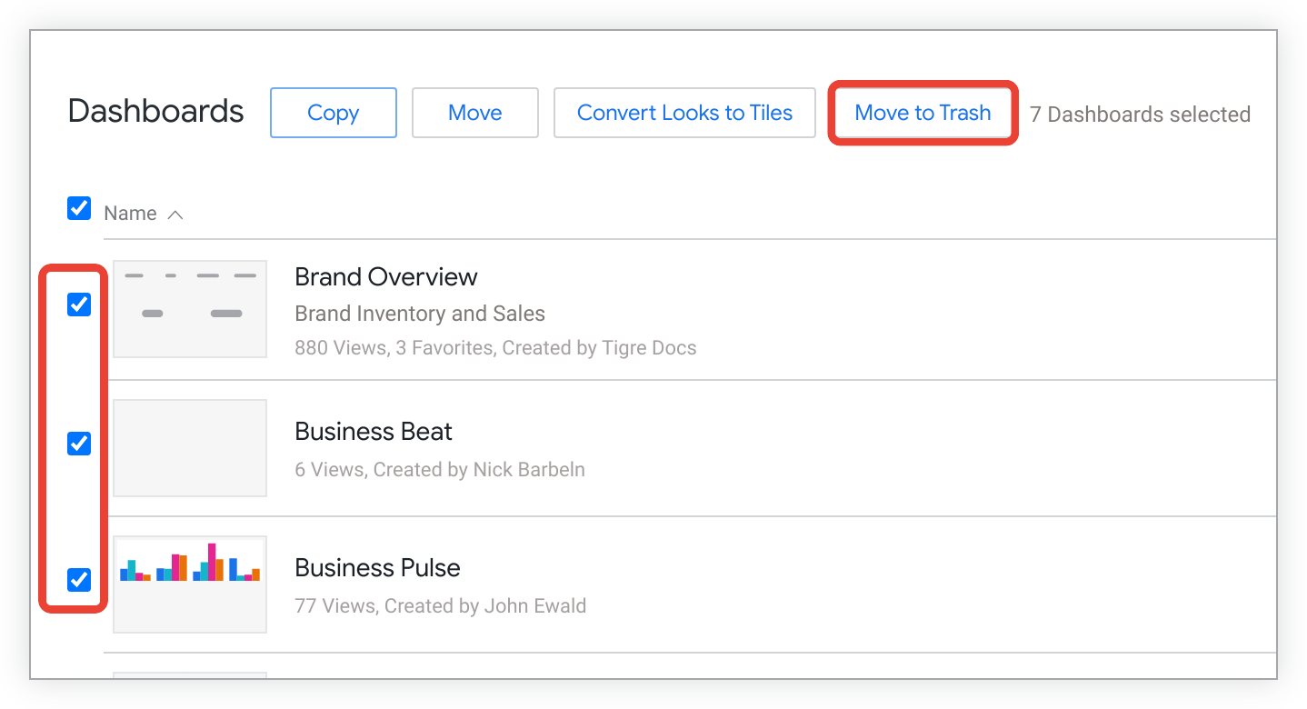 - Select the checkbox for each Look or dashboard that you want to delete.